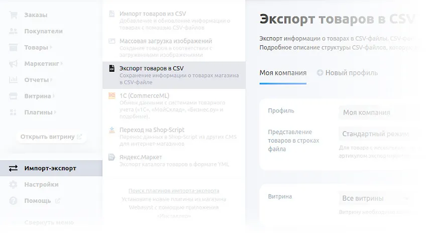Экспорт товаров в CSV-файл позволяет перенести каталог в другой магазин или обновить информацию о товарах через табличный редактор.