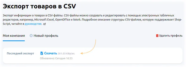 После завершения экспорта вверху раздела появится ссылка для скачивания последнего экспортированного файла.