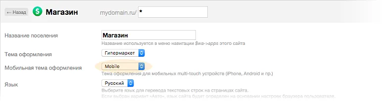 Для покупателей со смартфонами рекомендуется использовать тему Mobile. Её нужно выбрать в настройках приложения «Сайт» в разделе Структура.