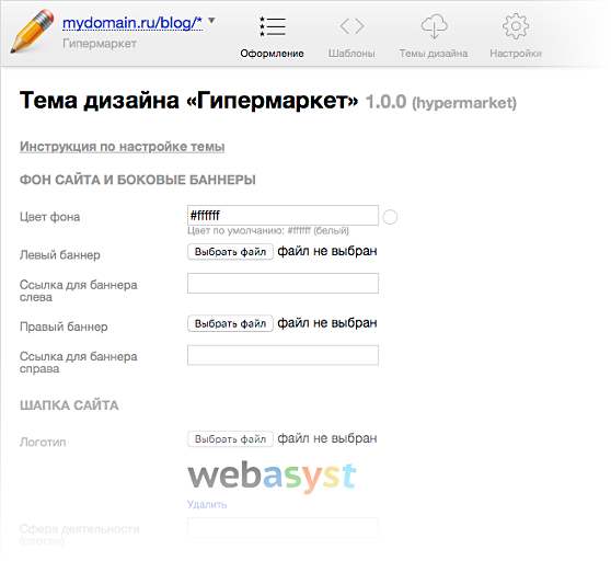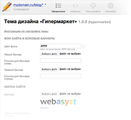 В верхней части страницы перечислены настройки приложения «Сайт». Его тема является общей для всего семейства «Гипермаркет» — она задаёт общий стиль для всех приложений.