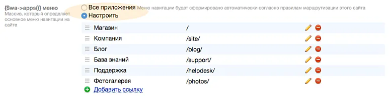 Заголовок раздела «Настройка главного меню»Главное меню сайта настраивается в разделе Настройки → {$wa->apps()} меню приложения «Сайт».