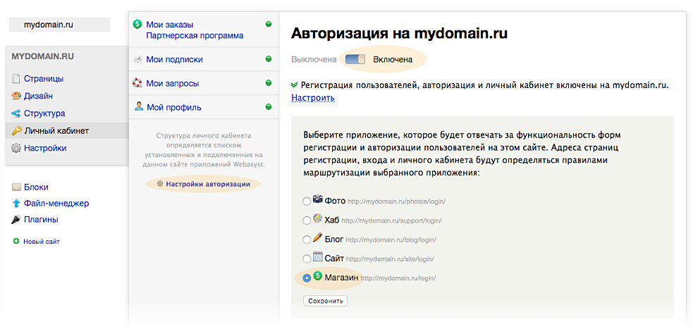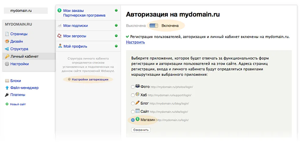 Рекомендуется выбрать Shop-Script в качестве приложения для авторизации и регистрации в разделе Личный кабинет → Настройки авторизации.