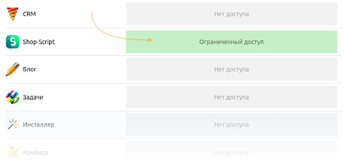 Заголовок раздела «Где настроить права доступа»Перейдите в раздел Команда → [пользователь] → Доступ → Shop-Script и нажмите кнопку с обозначением прав доступа справа от нужного сотрудника.