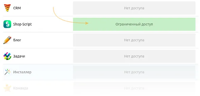 Заголовок раздела «Где настроить права доступа»Перейдите в раздел Команда → [пользователь] → Доступ → Shop-Script и нажмите кнопку с обозначением прав доступа справа от нужного сотрудника.