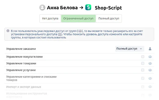 Заголовок раздела «Выбор уровня доступа»Если сотруднику не нужен полный доступ ко всем функциям магазина, выберите уровень Ограниченный доступ. После этого включите доступ к тем разделам и функциям, с которыми пользователь должен работать.