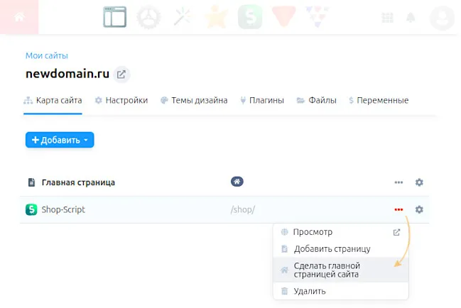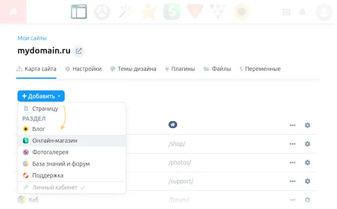 Заголовок раздела «Новая витрина на том же домене»- Перейдите в раздел Сайт → Карта сайта.