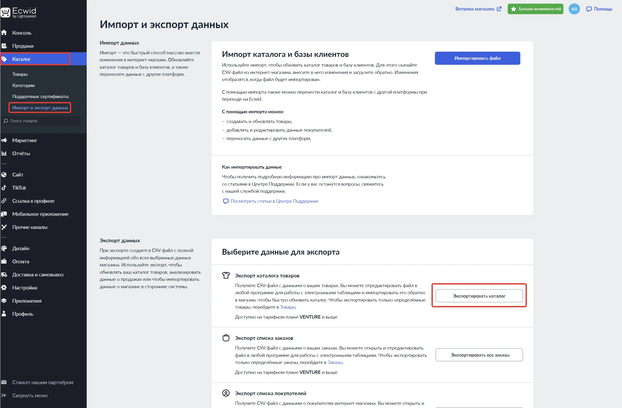 Заголовок раздела «Экспорт товаров из Ecwid»- Откройте панель управления Ecwid и перейдите в раздел «Каталог → Импорт и экспорт данных».