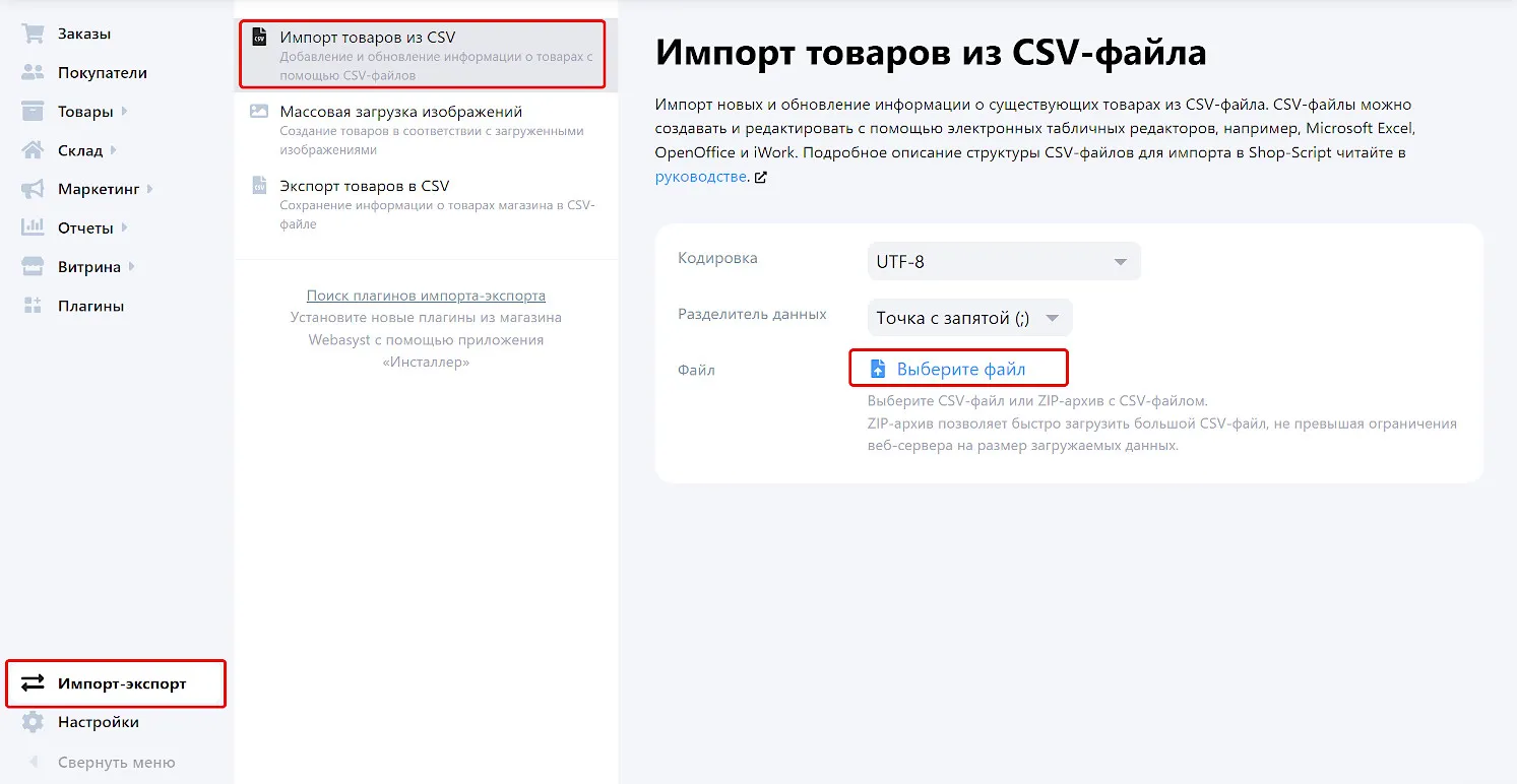 В панели управления магазина перейдите в раздел «Импорт-экспорт → Импорт товаров из CSV» и выберите подготовленный файл.