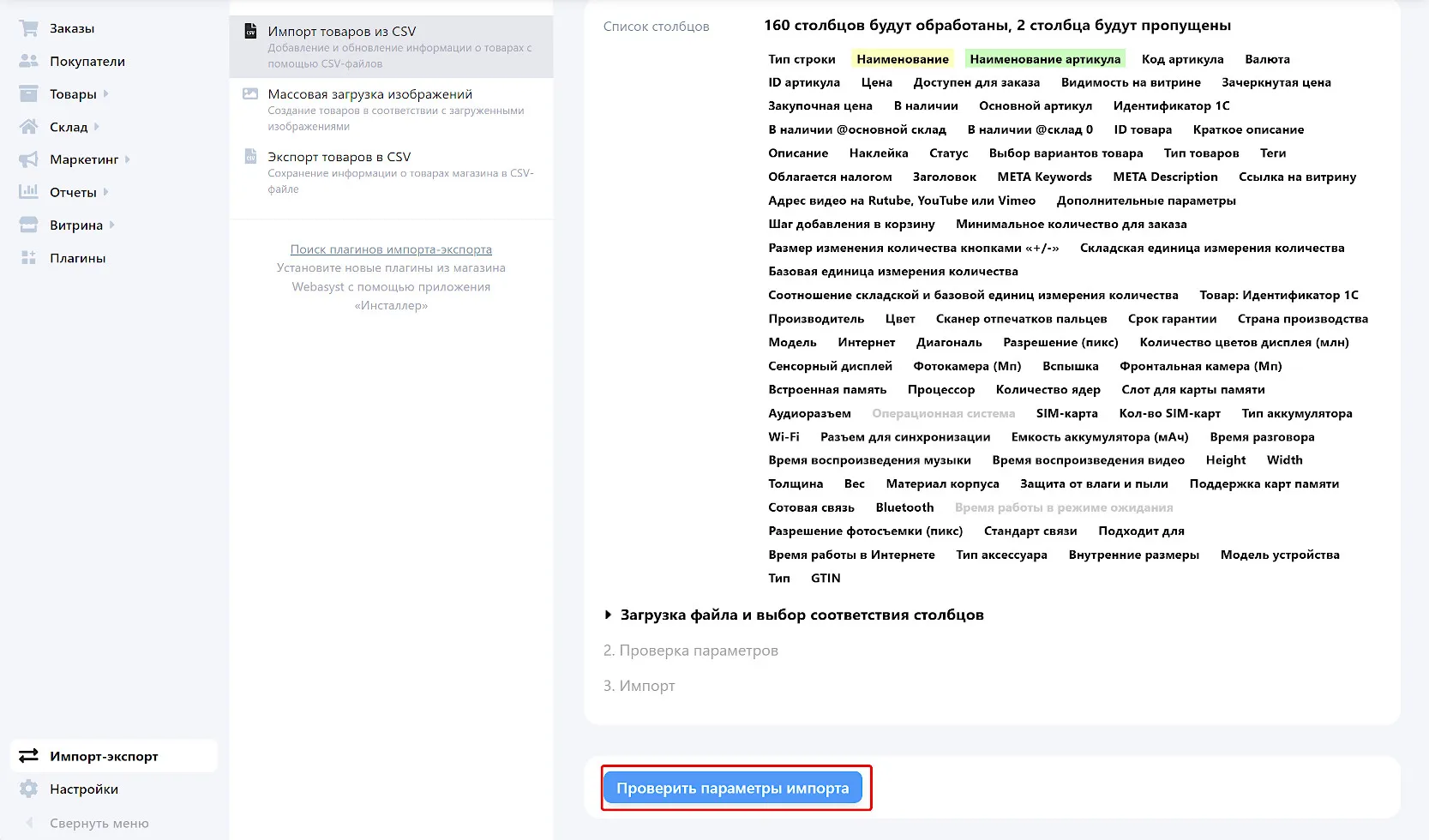 После загрузки появится список столбцов файла. Для некоторых столбцов соответствие будет выбрано автоматически. Проверьте и исправьте настройки, если нужно.