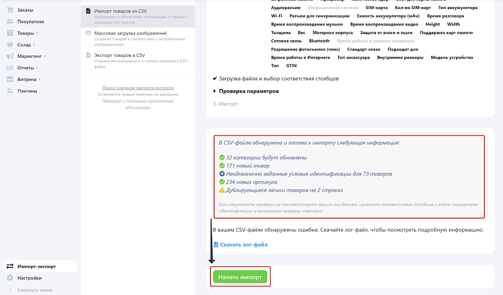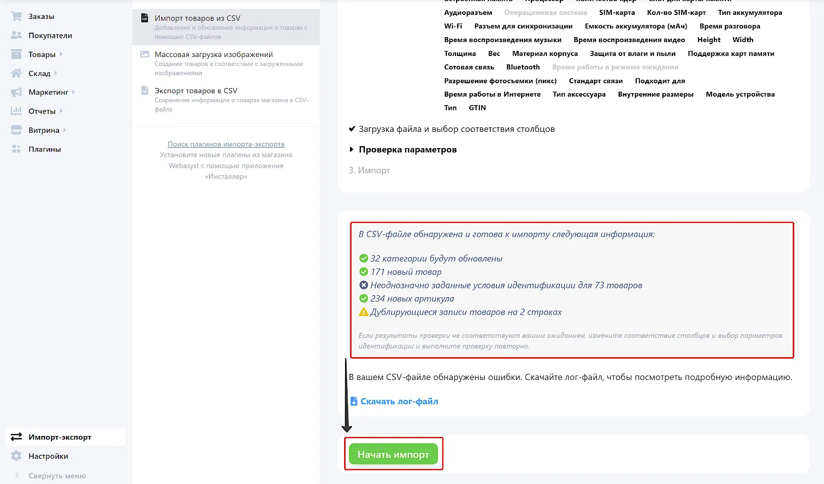 Нажмите «Начать импорт» и дождитесь завершения. Время зависит от количества товаров в каталоге.