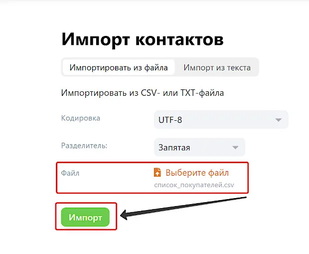 Выберите CSV-файл с покупателями и нажмите «Импорт».