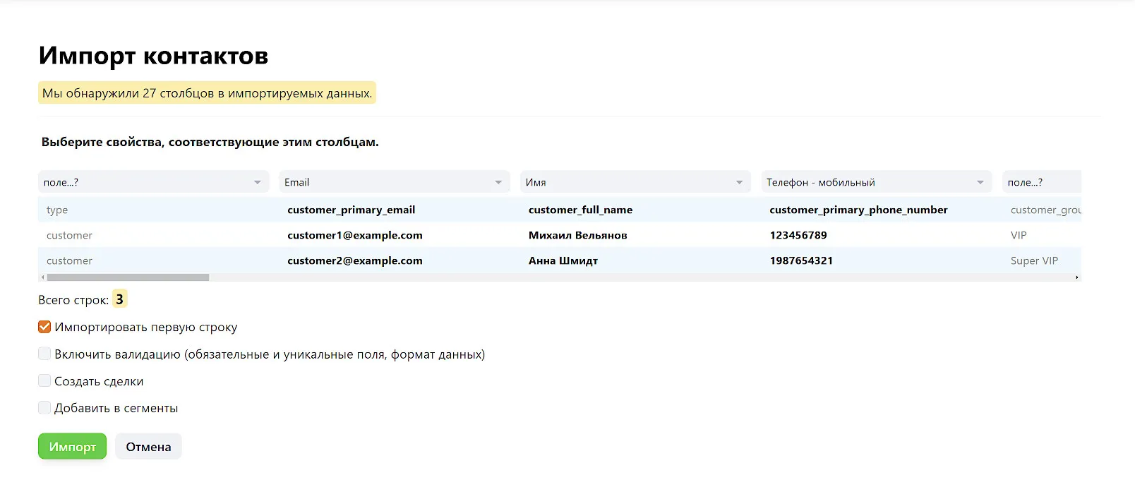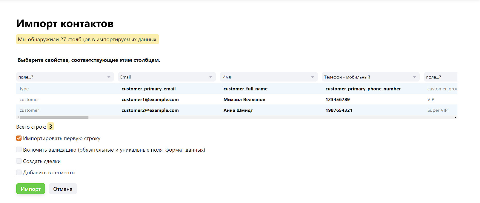 Настройте соответствие столбцов файла полям контактов в CRM и нажмите «Импорт».
