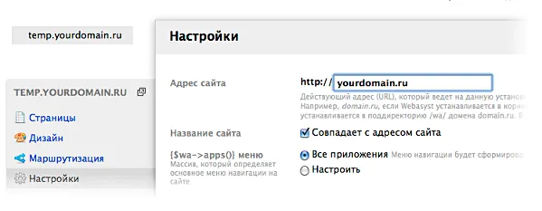 В разделе «Настройки» в панели управления магазином в поле «Адрес сайта» вместо временного адреса введите доменное имя, на котором сейчас работает старый магазин.