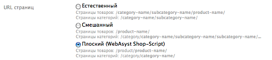 Если в старом магазине был включён режим человеко-понятных URL (ЧПУ), в настройках для параметра «URL страниц» выберите вариант «Плоский»: