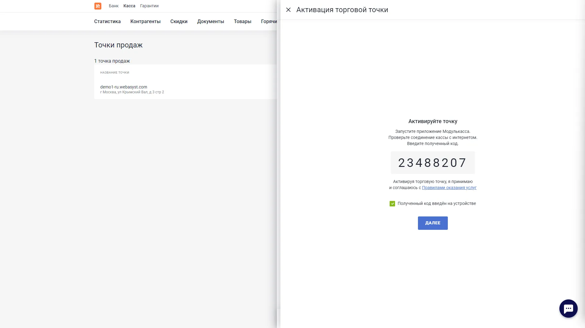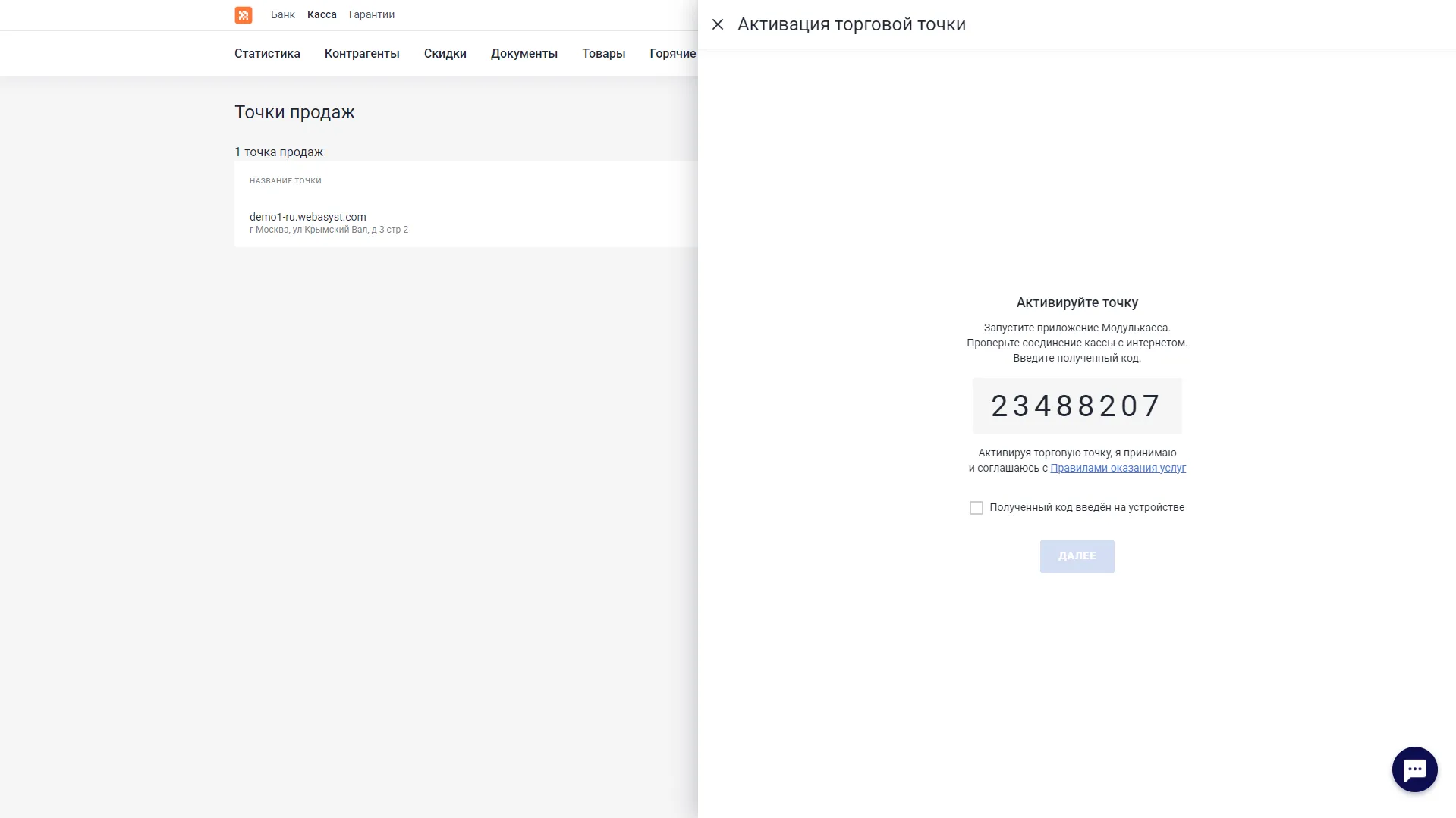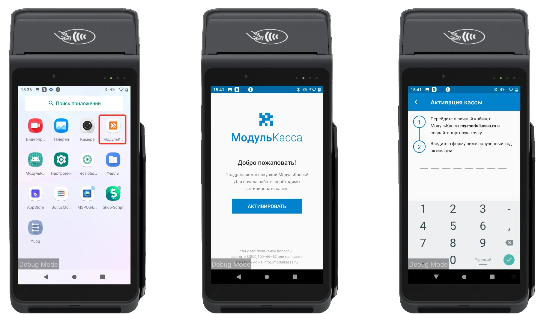 Включите терминал, откройте приложение «МодульКасса» и введите 8-значный код для активации кассы.