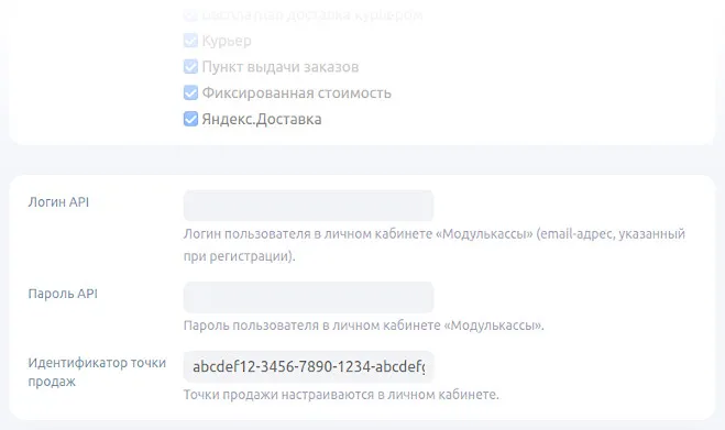 Поля «Логин API» и «Пароль API» заполните адресом электронной почты и паролем от вашего личного кабинета «МодульКассы».