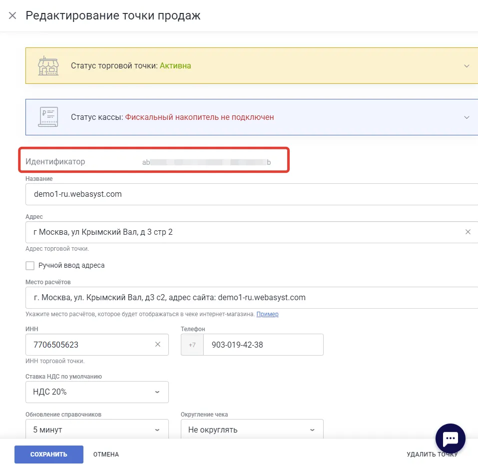 Чтобы получить идентификатор своей точки продаж, в разделе с точками продаж нажмите на добавленную вами точку.
