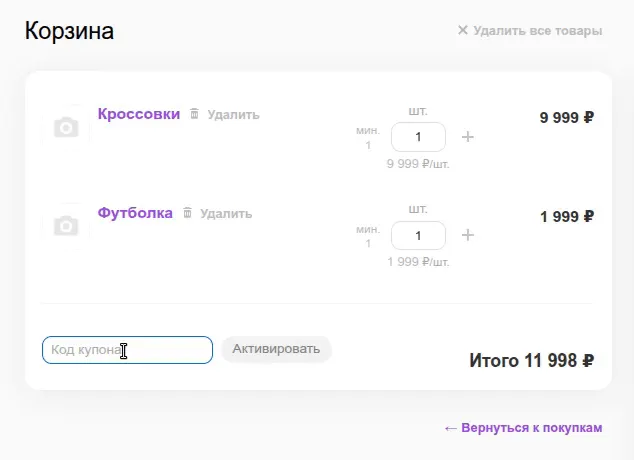 Купон (промокод) — это набор символов, который покупатель вводит на этапе оформления заказа для получения скидки. Это удобный способ привлечь новых клиентов, увеличить средний чек или провести акцию.