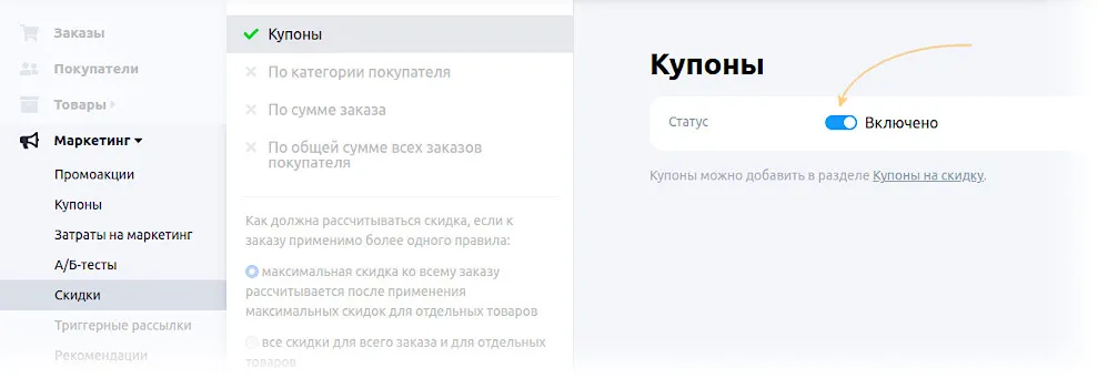 Заголовок раздела «Включение купонов»Чтобы покупатели могли использовать купоны, сначала включите этот тип скидок в панели управления магазином. Перейдите в раздел Маркетинг → Скидки → Купоны и включите эту функцию.
