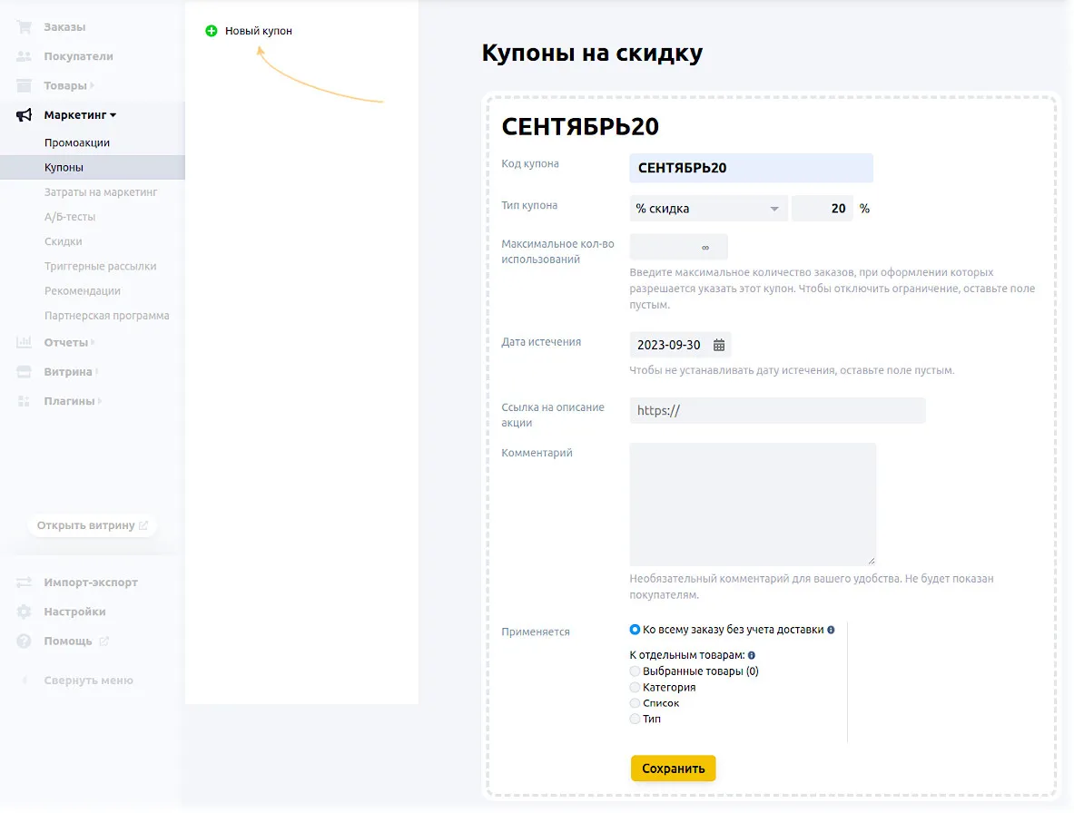 Заголовок раздела «Где создавать купоны»Добавляйте и редактируйте купоны в разделе Маркетинг → Купоны.