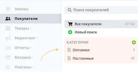 Заголовок раздела «Скидки по категории покупателя»Каждого зарегистрированного покупателя можно отнести к определённой категории: «Постоянные», «Оптовики», «VIP» и т.п. Категории создаются в разделе «Покупатели», где также указывается, какие покупатели в какую категорию входят.