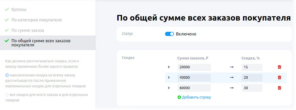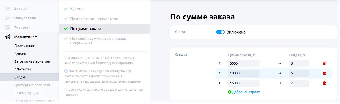Заголовок раздела «Скидки по сумме заказа»Скидка может зависеть от стоимости текущего заказа. Укажите пороговые значения суммы и размер скидки для каждого из них.