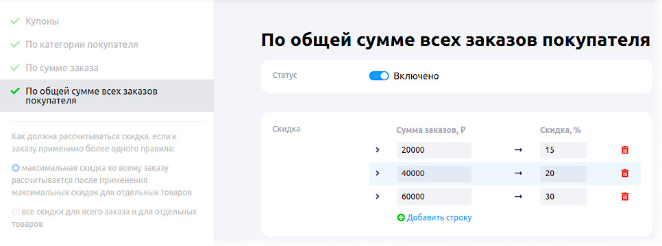 Заголовок раздела «Скидки по общей сумме заказов покупателя»Этот тип скидки рассчитывается от суммарной стоимости всех заказов конкретного покупателя. Как и в предыдущем случае, задайте пороговые значения и размеры скидок.
