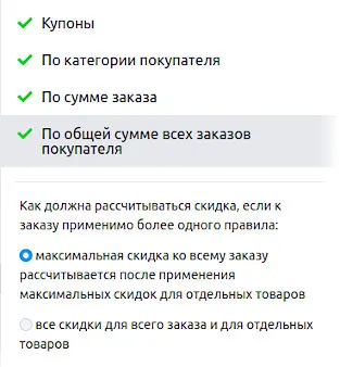 - Применять максимальную скидку — автоматически выбирается наиболее выгодная для покупателя скидка.
