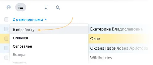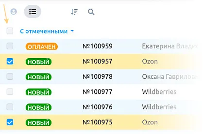 Отметьте нужные заказы в списке. Чтобы выбрать все заказы, используйте общий флажок в заголовке списка.