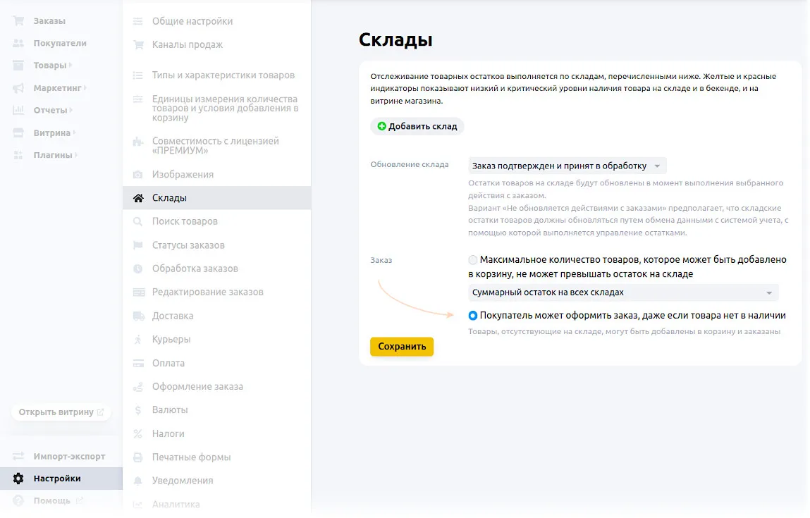 - Включите настройку «Покупатель может оформить заказ, даже если товара нет в наличии».