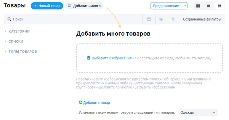 Если у вас много товаров с несколькими фотографиями each, загружать их по одному долго. В этом случае удобнее загрузить все изображения сразу — система автоматически распределит их по товарам.