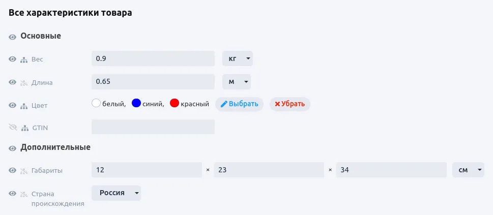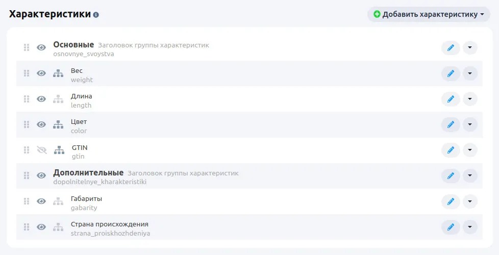Характеристики помогают покупателям увидеть подробную информацию о товаре: цвет, размер, вес, мощность и другие свойства. Это упрощает выбор и повышает продажи.