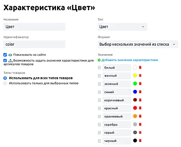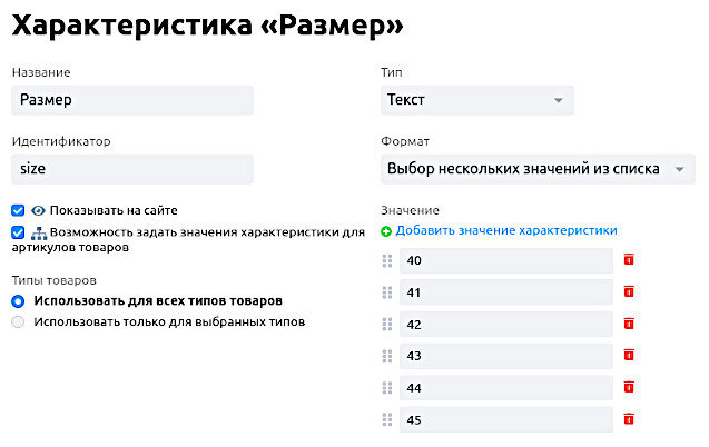 Создайте характеристики с форматом «Выбор нескольких значений из списка». В примере с кроссовками понадобятся две такие характеристики: «Размер» и «Цвет». При создании укажите их значения: