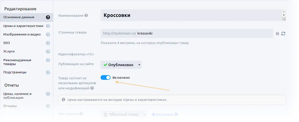 Создайте товар «Кроссовки» и включите режим «Товар состоит из нескольких артикулов или модификаций».