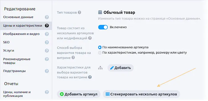 На вкладке «Цены и характеристики» нажмите «Сгенерировать несколько артикулов».