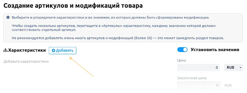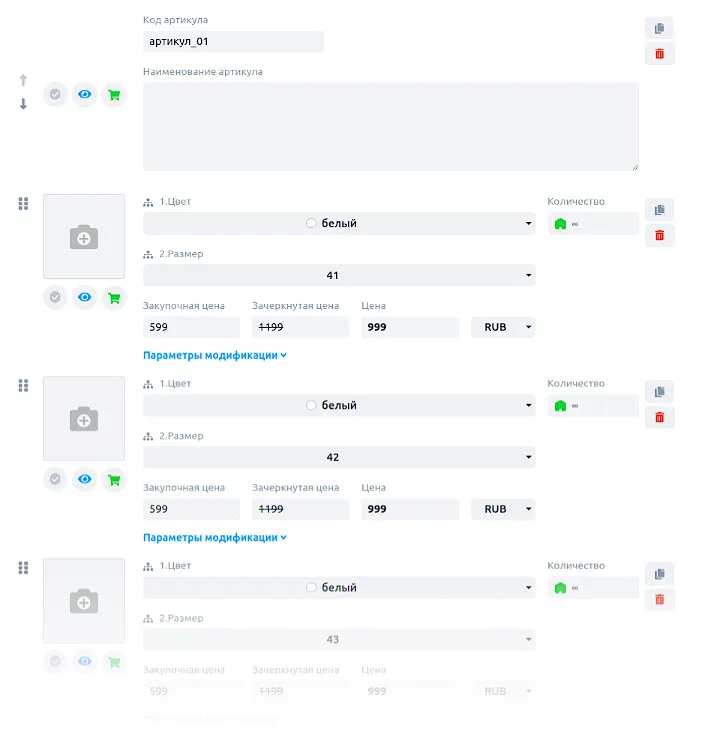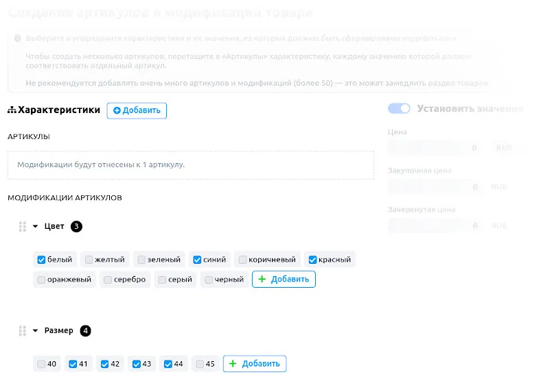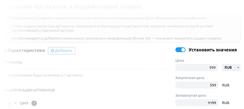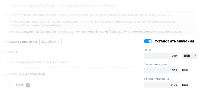 При необходимости укажите цену продажи, закупочную и зачёркнутую цены для всех модификаций. Эти цены будут одинаковыми для всех вариантов. Позже можно отредактировать цены отдельно для каждой модификации.