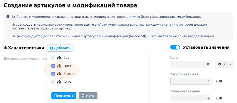 Добавьте характеристики «Размер» и «Цвет», нажмите «Применить».