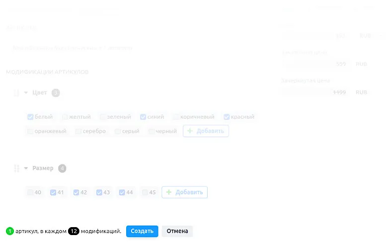 Нажмите «Создать», чтобы добавить все модификации в товар.