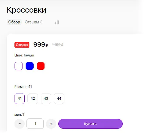 Заголовок раздела «Выбор товаров по характеристикам»Характеристики можно использовать не только для отображения свойств товара, но и для выбора нужного варианта. Например, покупатель ищет кроссовки 42-го размера белого цвета. Он выбирает размер и цвет, а Shop-Script автоматически добавляет в корзину подходящий товар.