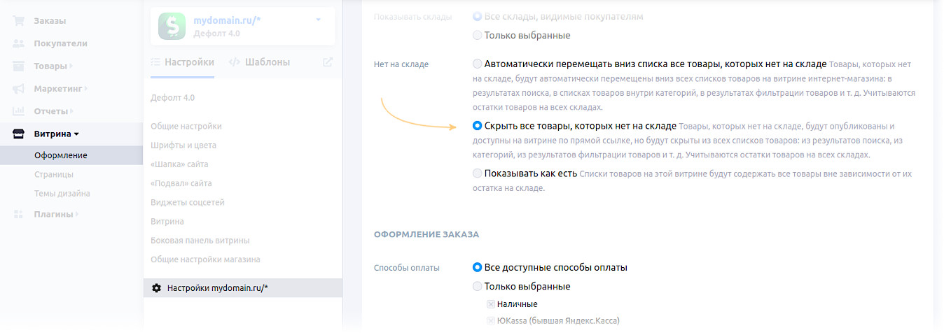 Затем в настройках витрины уберите галочку с этого типа — товары перестанут быть видны покупателям.