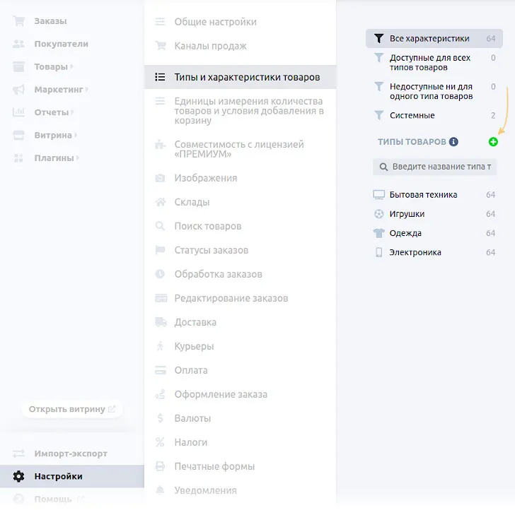Затем в настройках витрины уберите галочку с этого типа — товары перестанут быть видны покупателям.