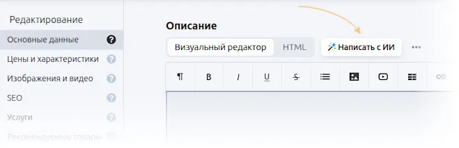 Начиная с версии Shop-Script 11.4.0 описания и другие SEO-параметры товаров можно заполнять автоматически с помощью искусственного интеллекта (ИИ). Это экономит время и помогает быстро заполнить каталог привлекательными описаниями.