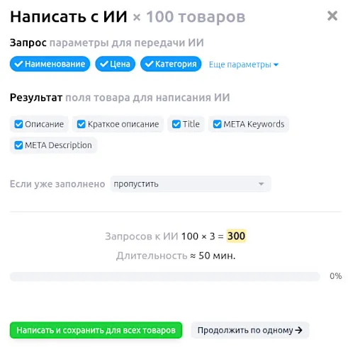 Откройте карточку товара на вкладках «Основные данные» и «SEO» и нажмите кнопку «Написать с ИИ». Альтернатива: выделите несколько товаров в списке и выберите действие «ИИ-описания и SEO». Обработка нескольких товаров доступна только с платной версией приложения.