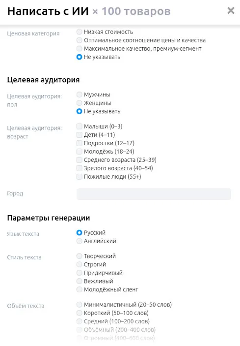 Дополнительно настройте параметры текста: ценовую категорию, целевую аудиторию (пол, возраст, город), особенности (язык, стиль, объём).