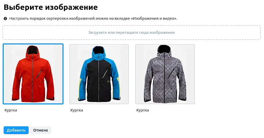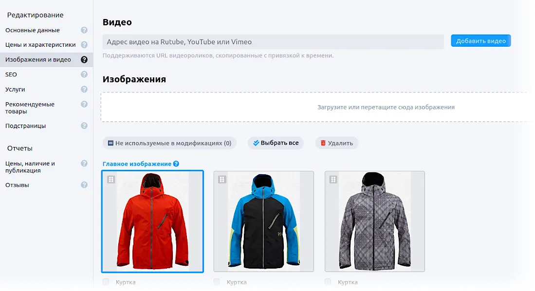 В карточке товара откройте вкладку «Изображения и видео» и загрузите фотографии всех модификаций.