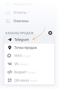 Заголовок раздела «Настройка в Shop-Script»Перейдите к созданию нового канала продаж: Shop-Script → Каналы продаж → Telegram.