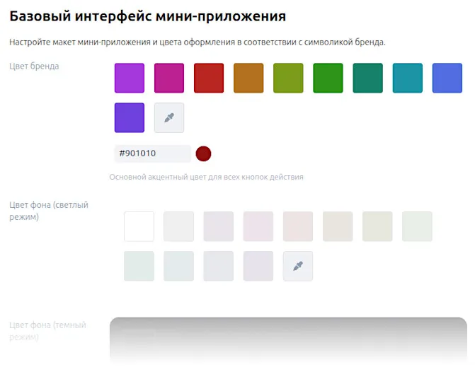 Базовый интерфейс — настройте внешний вид мини-приложения: цвета оформления, радиус закругления элементов, количество товаров в ряду, язык витрины.