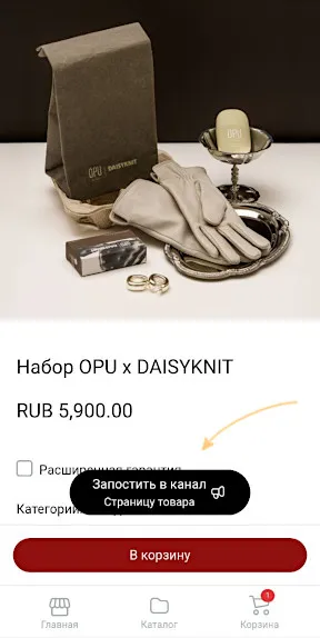 На какой странице витрины вы нажмёте эту кнопку, на такую страницу будет вести отправленная в канал ссылка. Можно отправлять кнопки для: