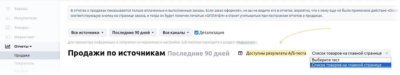 Заголовок раздела «Шаг 3. Наблюдайте за результатами»Результаты теста появятся в разделе Shop-Script → Отчеты → Продажи, когда появятся заказы от покупателей, посетивших страницу с кодом А/Б-теста.
