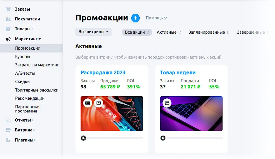 Заголовок раздела «Как создать промоакцию в интернет-магазине»Промоакции помогают привлекать покупателей, делать специальные предложения и отслеживать эффективность рекламы. С их помощью можно показывать баннеры, давать скидки на товары и учитывать, откуда пришли посетители.